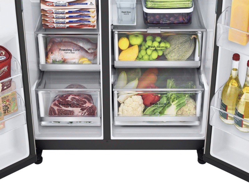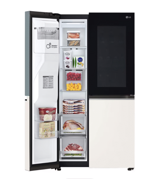 •ดีไซน์แบบ Side‑by‑Side พร้อมประตูสองฝั่ง (ช่องเย็น–ช่องแช่แข็ง) จัดเก็บได้เป็นหมวดหมู่ มีชั้นวางกระจกนิรภัยลึก แข็งแรง และช่องเก็บ Door‑in‑Door (InstaView)