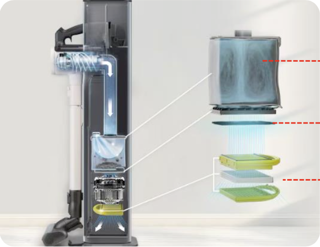 •มี ระบบกรองระดับ 5 ขั้นตอน พร้อมถุงเก็บฝุ่นแบบถอดทิ้ง และ UVC LED ฆ่าเชื้อในถุงฝุ่น ช่วยลดการสะสมของเชื้อแบคทีเรีย